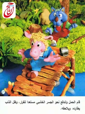 قام الحمل واندفع نحو الجسر الخشبي مستعدا للفرار ، وظل الذئب يطارده ويلاحقه .